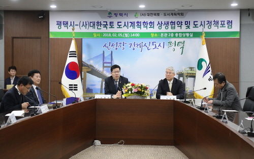 평택시(시장 공재광)와 (사)대한국토·도시계획학회(학회장 김홍배)는 지난 5일 평택시의 지속가능발전과 편안하고 쾌적한 도시공간 조성을 위한 협력 강화를 내용으로 상생협약을 체결했다.