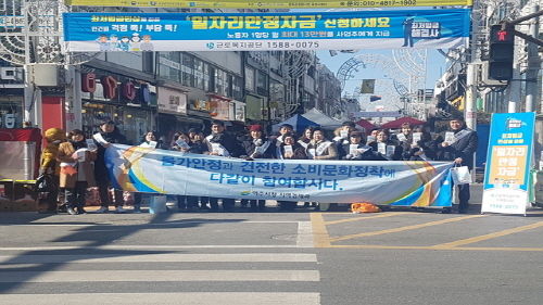 일자리 안정자금은 30인 미만의 근로자를 고용한 사업주에게 월 보수액 190만원 미만 근로자 1명당 월 최대 13만원을 지원하는 사업으로 한파인 날씨에도 불구하고 소비자교육진흥회원들을 비롯한 공무원 등이 어깨띠를 두르고 홍보에 나섰다.