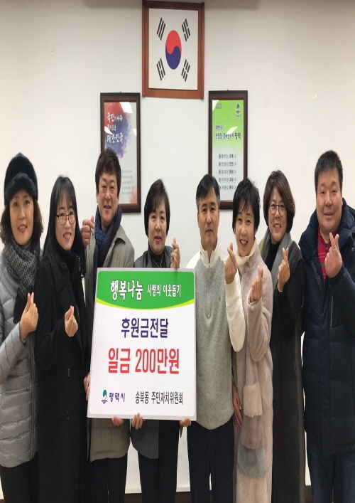 송북동 주민자치위원회(위원장 최관문)는 다가오는 설을 맞이하여 도움의 손길이 필요한 사회취약계층을 위하여 성금 2백만원을 송북동주민센터에 전달했으며 이날 전달 된 후원금은 독거노인 등 도움이 필요한 20세대에 전달 될 예정이다.