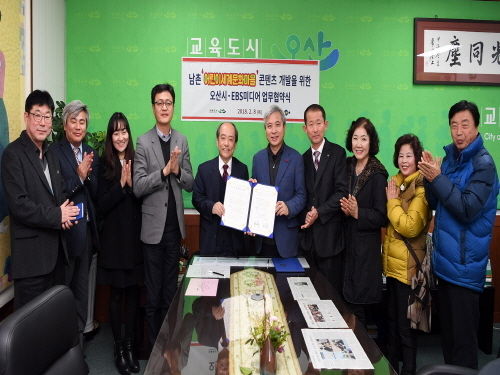 이번 협약의 목적은 오산시가 남촌마을에 진행하는‘어린이세계문화마을’사업에 번개맨 및 EBS의 다양한 캐릭터를 사용하여 콘텐츠를 조성한다는 협약으로 기존 마을환경개선 위주의 도시재생에서 한 발짝 더 나아가 마을을 바꾸는 문화가 있는 도시재생으로 진행된다는데 그 의의가 있다.