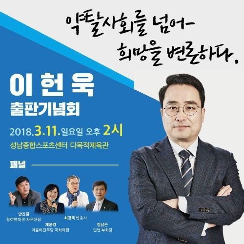 이날 출판기념회에는 제윤경 국회의원을 비롯해 안진걸 참여연대 전 사무처장, 최강욱 변호사, 김남근 민변 부회장이 게스트로 출연해 이헌욱 예비후보를 빛내줄 예정이다.