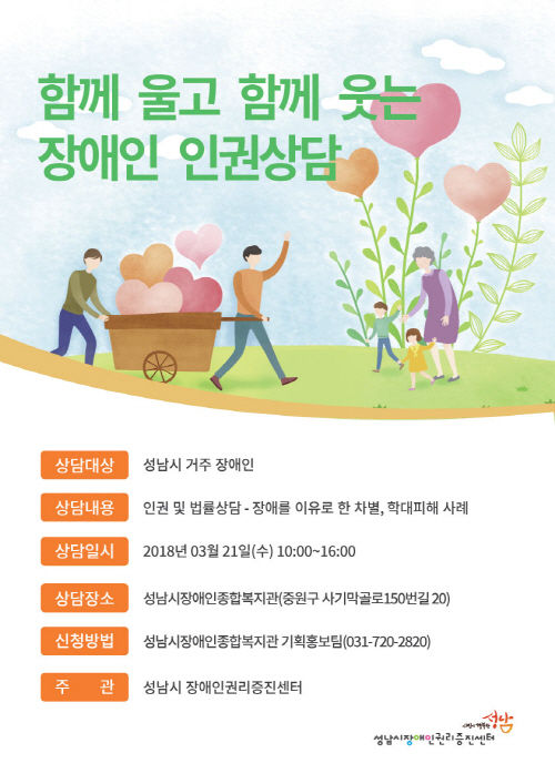 성남시 장애인권리증진센터(센터장 김무웅)는 오는 3월 21일 상대원동 성남시장애인종합복지관에서 오전 10시부터 오후 4시까지 인권상담을 진행한다. 거리상의 이유나 기타 사정으로 방문상담이 어렵거나 인권 사각지대에 놓여있는 장애인을 위해 성남시장애인종합복지관(성남시 중원구)으로 직접 찾아갈 예정이다.
