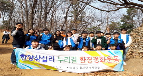 이번 행사는 송정동 청소년자치위원회를 중심으로 학생들이 주축이 돼 학생 및 주민자치위원 등 30여명이 참여했으며 목현동 ~ 오전리 구간에 있는 쓰레기 수거 및 불법광고물을 제거하고 한양 삼십리 누리길을 직접 탐방하며 생생한 체험 활동을 했다.