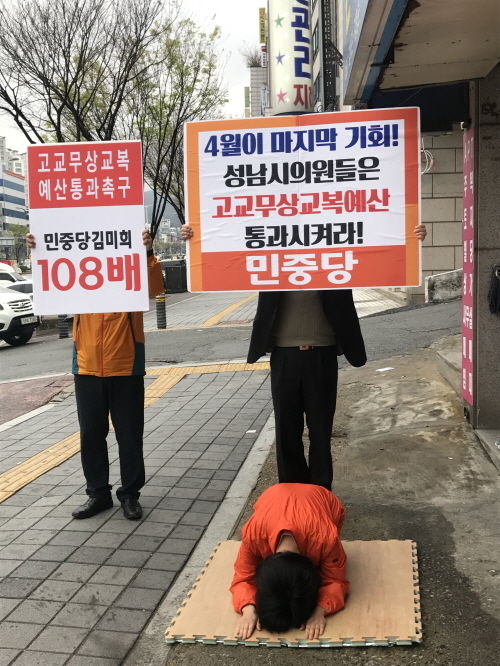 민중당 경기도당 상임위원장인 김미희 전 국회의원은 “성남시의회의 구태정치 낡은정치가 도를 넘었다”면서 “쪽수정치 구태정치를 청산하는 것은 촛불시민혁명 과제의 하나”라며 오늘 성남시의회 예산결산특별위원회 회의와 9일 본회의에서 무상교복 예산이 꼭 통과되기를 기원하는 108배에 나섰다.