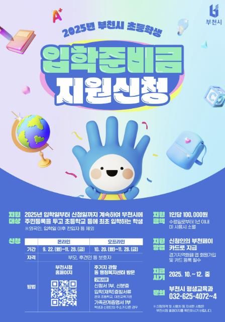 (중부시사신문) 부천시는 2025학년도 초등학교에 입학한 신입생을 대상으로, 가정의 교육비 부담을 덜고 원활한 학교생활 적응을 돕기 위해 1인당 10만 원의 입학준비금을 부천페이로 지급한다고 밝혔다.