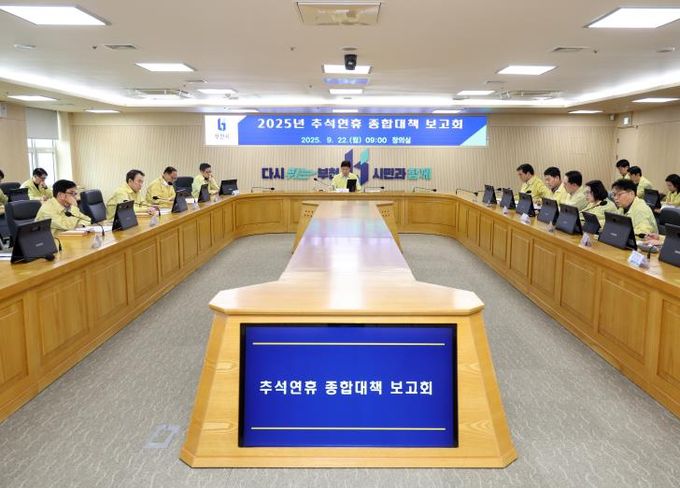 (중부시사신문) 부천시는 지난 22일 시청 창의실에서 조용익 시장을 주재로 부시장을 비롯한 국장과 부서장이 참석한 가운데 ‘2025년 추석 연휴 종합대책 보고회’를 열었다. 이번 보고회는 7일간 이어지는 추석 연휴를 앞두고 시민 생활 전반에 걸친 분야별 대책을 점검하기 위해 마련됐다.