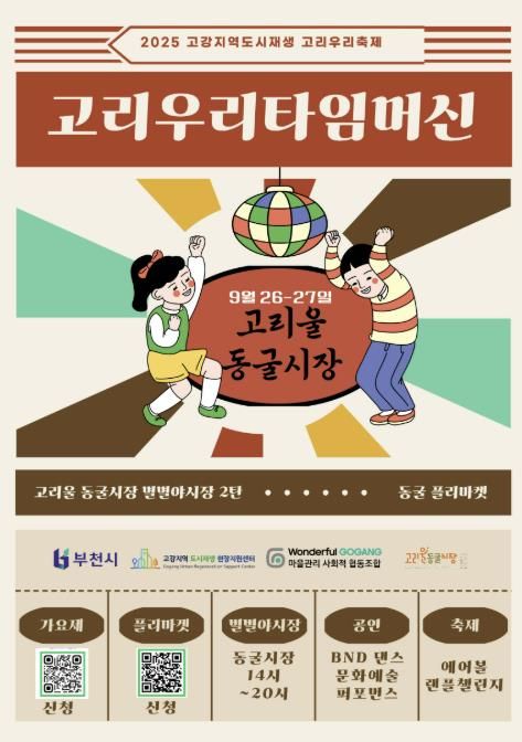(중부시사신문) 부천시는 9월 26일부터 27일까지 이틀간 오정구 고리울 동굴시장에서 ‘2025 고리우리축제’를 연다고 23일 밝혔다. 이번 행사는 부천시 원도심재생과가 주최하고 원더풀고강마을관리 사회적협동조합이 주관한다.