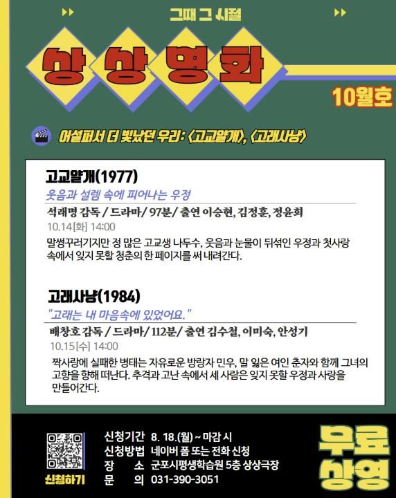(중부시사신문) 군포문화재단 군포시평생학습원은 시민들의 문화 향유와 세대 공감을 위해 오는 10월 14일과 15일 상상극장에서 고전 영화 상영 프로그램 〈상상명화〉를 운영한다. 이번 상영작은 ‘고교얄개’와 ‘고래사냥’으로 무료 상영된다.