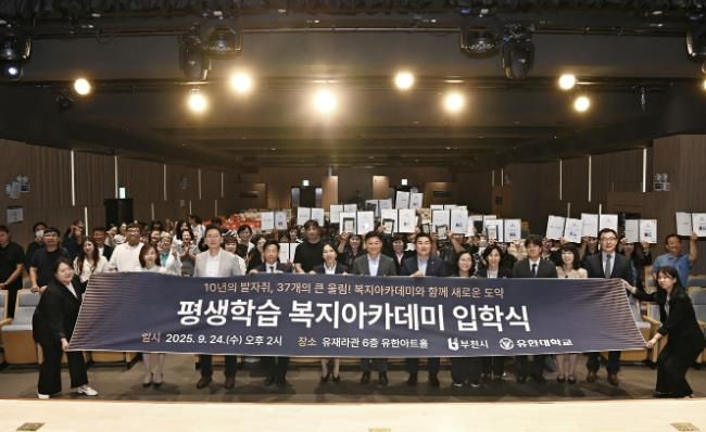 (중부시사신문) 부천시는 지난 24일 유한대학교에서 ‘부천시·유한대학교 복지아카데미’ 입학식과 업무협약식을 열었다. 이번 행사는 조용익 부천시장과 장은영 유한대학교 총장을 비롯해 37개 동 지역사회보장협의체 위원장 등 150여 명이 참석한 가운데 진행됐다.