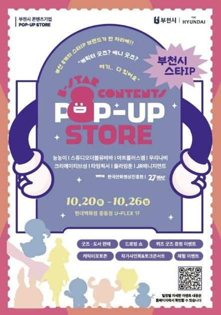 (중부시사신문) 부천시는 10월 20일부터 26일까지 현대백화점 중동점 U-PLEX 1층에서 지역 우수 콘텐츠 기업 8개 사가 참여하는 팝업스토어 ‘8 CONTENTS, ONE STAGE in BUCHEON’을 운영한다.