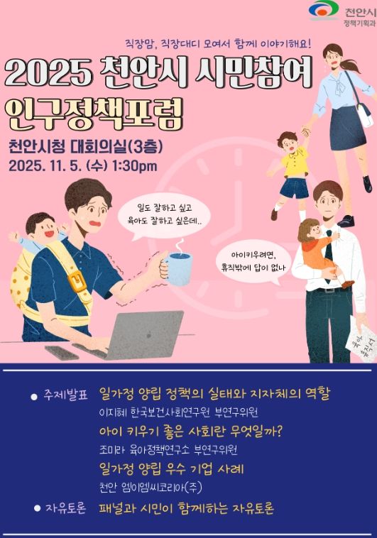 (중부시사신문) 천안시는 다음 달 5일 시청 대회의실에서 ‘2025 천안시 시민참여 인구정책포럼’을 개최한다.