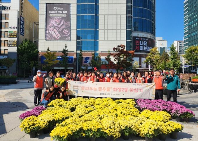 참여자들은 화정역 광장과 화정31호 경관광장 화단 주변에 국화 130여 본을 식재하며 꽃향기가 듬뿍 나는 거리를 조성했다.