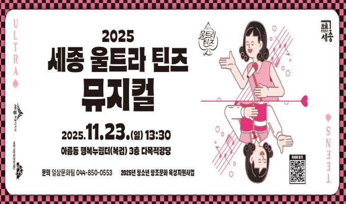 (중부시사신문) 세종시문화관광재단은 11월 23일, 아름동 행복누림터 3층 다목적강당에서 청소년 무대예술 교육 프로그램의 성과를 선보이는 ‘2025 세종 울트라 틴즈 뮤지컬’ 공연을 개최한다. 이번 공연은 약 4개월간의 교육 과정을 통해 성장한 청소년들의 창작 역량을 발표하는 자리다.