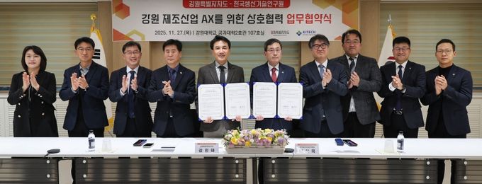 (중부시사신문) 강원특별자치도는 11월 27일 오후 3시, 강원 제조산업의 AX(AI Transformation, 인공지능 전환)를 위한 상호 협력을 강화하기 위해 한국생산기술연구원(원장 이상목)과 업무협약(MOU)을 체결했다.