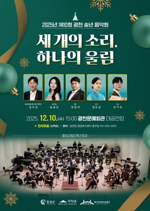 정희채 광천읍장은 "이번 송년음악회는 한 해 동안 애쓰신 읍민들에게 감사와 위로를 전하고, 다가오는 새해를 희망차게 맞이하자는 의미로 기획됐다"며, "특히 지역 출신 예술인들이 고향에서 아름다운 선율을 나눌 수 있어 더욱 뜻깊다. 읍민 여러분의 많은 관심과 참여를 부탁드린다"고 전했다.
