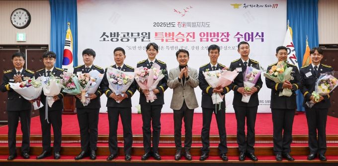 (중부시사신문) 강원특별자치도는 12월 3일 도청 신관 대회의실에서 도민의 생명과 안전을 지키는 데 헌신한 우수 소방공무원 8명에 대해 특별승진 임용장 수여식을 개최했다고 밝혔다.