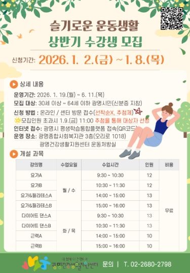 (중부시사신문) 광명시 광명건강생활지원센터는 새해를 맞아 시민들의 건강한 생활습관 형성과 만성질환 예방을 위해 2026년 상반기 ‘슬기로운 운동생활’ 운동 프로그램 참여자를 모집한다.