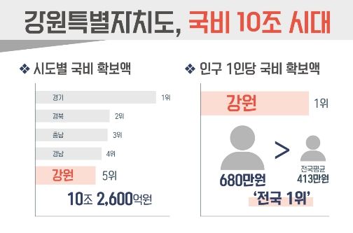 (중부시사신문) 강원특별자치도는 국비 확보 10조 시대에 진입한 가운데, 인구 1인당 국비 확보액이 약 680만 원으로 전국 1위에 해당한다고 밝혔다.