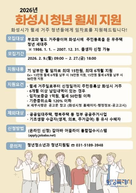 (중부시사신문) 화성특례시가 청년들의 주거비 부담을 덜고 안정적인 주거 생활을 지원하기 위해 2월 9일부터 2월 27일까지‘청년 월세 지원 사업’ 신청자를 모집한다고 밝혔다.