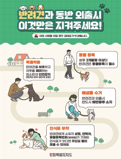 또한 반려동물 동행 캠페인은 18개 시군, 강원특별자치도수의사회 등과 협력하여, 역, 터미널, 전통시장, 대형마트 등 반려인들이 자주 왕래하는 장소에 현수막 게시, 포스터 부착 등을 통해 진행하며, 외출 시 목줄, 가슴줄(2미터 이하) 및 인식표 착용, 배변봉투 챙기기 등에 대해 집중 홍보할 계획이다.