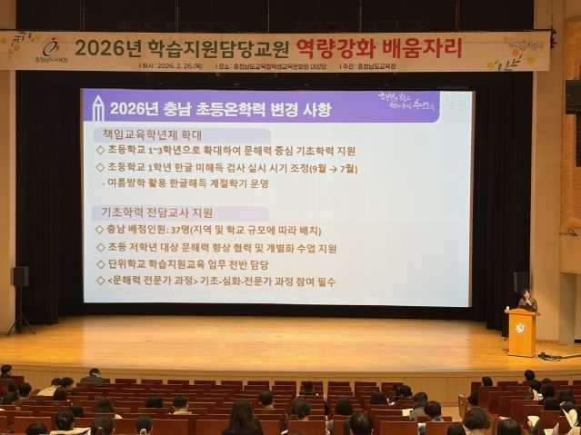 (중부시사신문) 충남교육청은 26일 충남교육청학생교육문화원(천안)에서 2026년 학습 지원 담당 교원 410명과 14개 시군 교육지원청 기초학력 담당 장학사를 대상으로 배움자리를 개최했다.