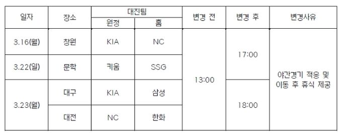 (중부시사신문) 2026 KBO 시범경기 중 일부 경기의 개시 시간이 야간경기 적응 및 이동 후 휴식 제공을 위해 변경됐다.