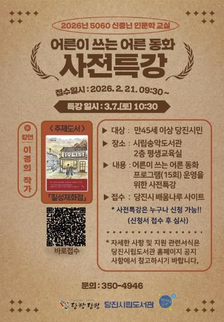 (중부시사신문) 당진시는 송악도서관에서 세대 맞춤형 글쓰기 프로그램의 일환으로 만 45세 이상을 대상으로 한 ‘어른이 쓰는 어른동화(2026년 5060 신중년 인문학 교실)’를 운영한다고 4일 밝혔다.