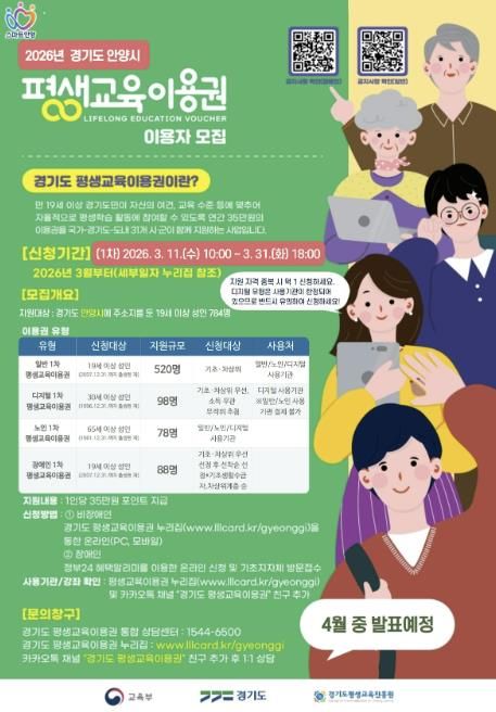 (중부시사신문) 안양시는 저소득층, 어르신, 장애인 등 교육 취약계층의 평생학습 기회를 보장하기 위한 총 3억 원 규모의 ‘2026년 평생교육 이용권(바우처) 지원사업’을 추진한다고 11일 밝혔다.