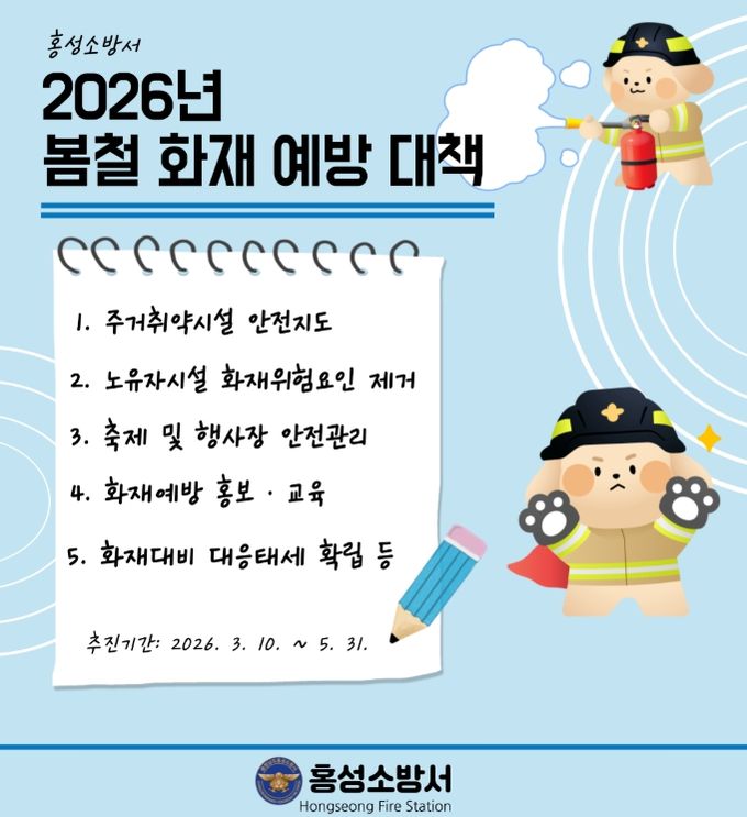(중부시사신문) 홍성소방서는 봄철 건조한 날씨와 강풍, 야외활동 증가 등으로 화재 발생 위험이 높아짐에 따라 오는 5월 31일까지 3개월간 봄철 화재예방대책을 본격 추진한다고 밝혔다.