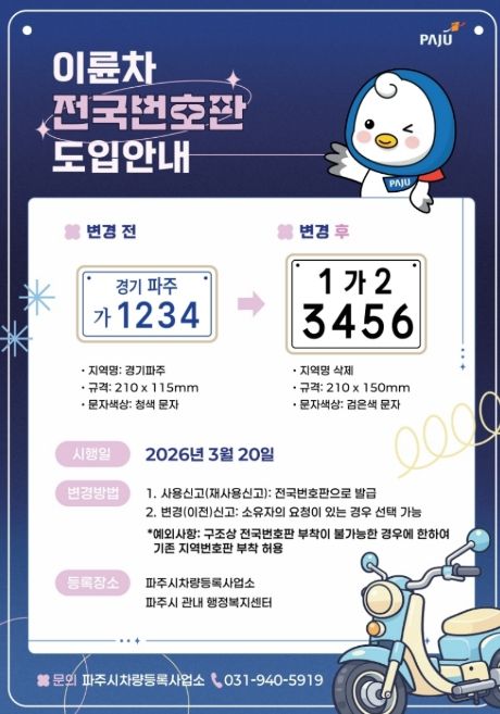 (중부시사신문) 파주시는 오는 20일부터 이륜차 전국번호판 제도를 본격 시행한다.