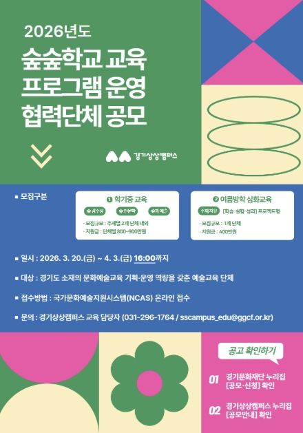 (중부시사신문) 경기문화재단 경기상상캠퍼스는 3월 20일부터 4월 3일 16시까지 2026 경기상상캠퍼스 ‘숲숲학교’ 교육 협력단체를 공개 모집한다.