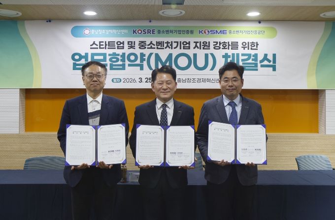 (중부시사신문) (재)충남창조경제혁신센터는 25일 중소기업벤처인증원, 중소벤처기업진흥공단 충청연수원과 스타트업 및 중소벤처기업의 성장 지원을 위한 업무협약(MOU)을 체결했다고 밝혔다.