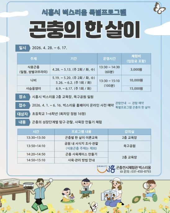 (중부시사신문) 시흥시 곤충체험전시관 ‘벅스리움’은 오는 4월 28일부터 6월 17일까지 초등학생을 대상으로 특별프로그램 ‘곤충의 한 살이’를 운영한다.