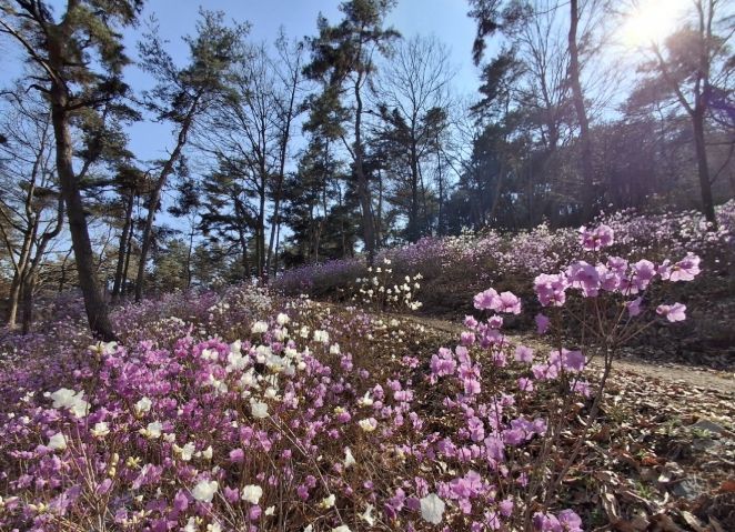 특히 일반적인 분홍 진달래 사이사이에 피어난 순백의 백진달래는 등산객들에게 색다른 볼거리를 선사하고 있으며, 산책로 주변에 함께 식재된 철쭉과 맥문동이 4월 말부터 차례로 꽃망울을 터뜨려 봄 내내 끊이지 않는 꽃길을 선사할 예정이다.