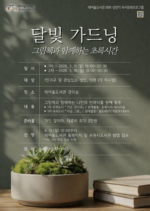 (중부시사신문) 수원시 매여울도서관이 그림책 읽기와 식물 가드닝을 결합한 체험형 프로그램 ‘달빛 가드닝, 그림책과 함께하는 초록시간’을 운영한다.