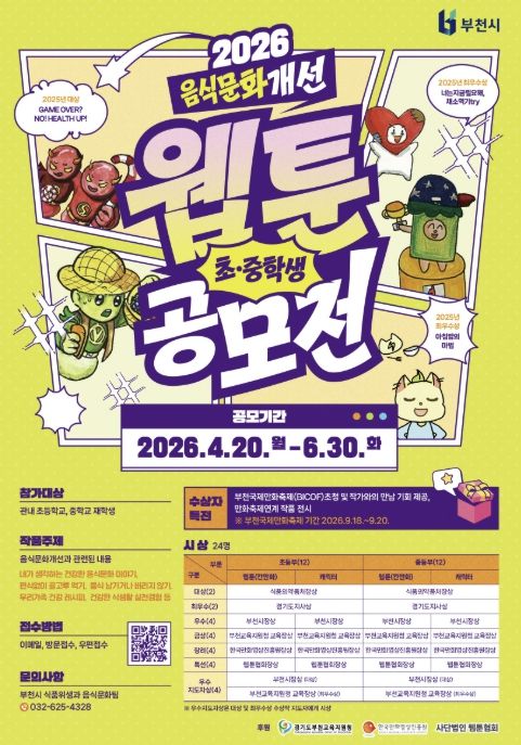 (중부시사신문) 부천시는 4월 20일부터 6월 30일까지 ‘2026년 음식문화개선 초중학생 웹툰·캐릭터 공모전’을 연다. 이번 공모전은 학생들이 일상 속 음식문화를 주제로 직접 창작에 참여함으로써 올바른 식문화에 대한 인식을 높이기 위해 매년 추진되고 있다.