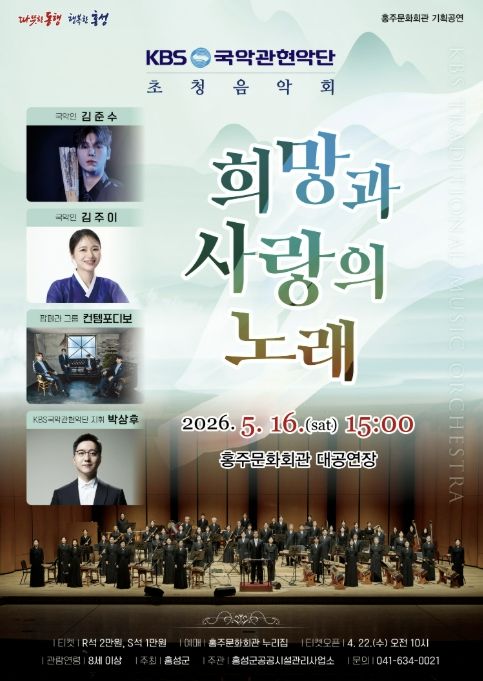 (중부시사신문) 홍성군 홍주문화회관은 오는 5월 16일 오후 3시, 가정의 달 특별 기획으로 'KBS국악관현악단 초청음악회 - 희망과 사랑의 노래'를 무대에 올린다.