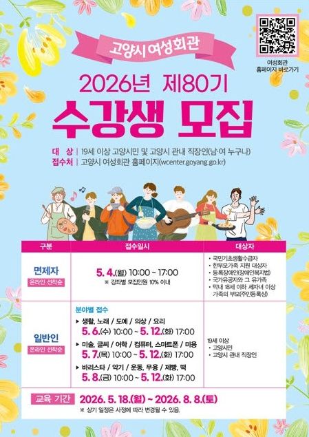(중부시사신문) 고양특례시 여성회관은 오는 5월 4일부터 12일까지 2026년 제80기 정규강좌 수강생을 모집한다.