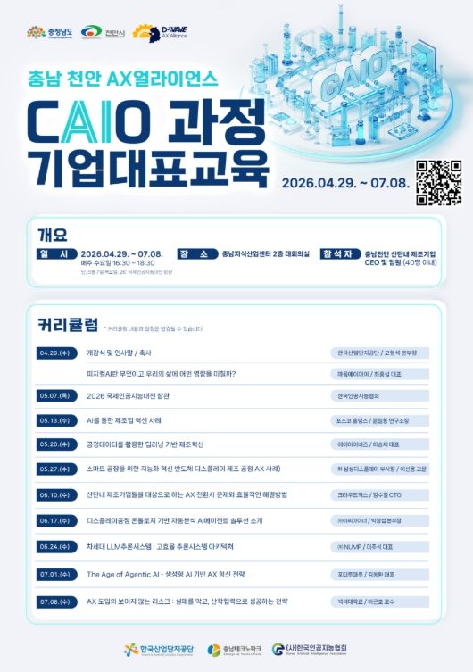 천안시는 산업단지 제조기업 CEO 및 임원을 대상으로 현장 맞춤형 AI 전략을 전수하는 ‘충남·천안 AX얼라이언스 CAIO(Chief AI Officer) 과정 기업대표교육’을 운영한다고 21일 밝혔다.