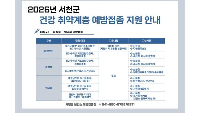 (중부시사신문) 서천군은 고령층과 임산부 등 건강 취약계층을 대상으로 대상포진, 백일해, 파상풍 예방접종 지원사업을 추진하는 가운데 올해 백일해와 파상풍 예방접종 지원 대상을 확대한다고 밝혔다.