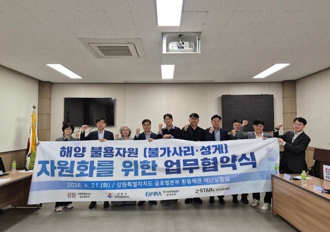 (중부시사신문) 강원특별자치도 제2청사(본부장 손창환)는 4월 21일 강원특별자치도청 제2청사 환동해관에서 강릉시, 한국수산자원공단, ㈜스타스테크와 함께 ‘해양 불용자원 자원화’를 위한 업무협약을 체결했다고 밝혔다.