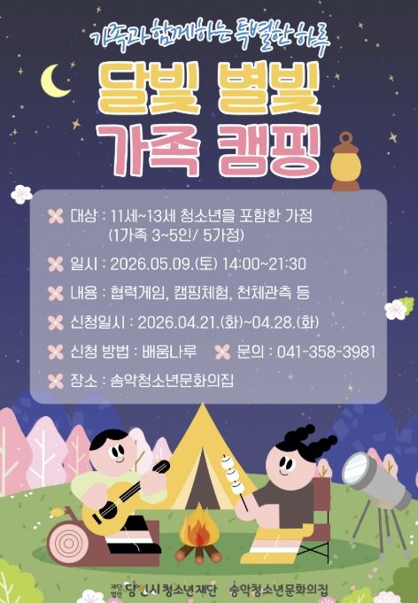 (중부시사신문) 송악청소년문화의집은 가족 간 소통과 유대감 강화를 위한 ‘2026년 가족캠핑 프로그램 달빛·별빛 가족캠핑’ 참가자를 모집한다.