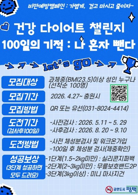 (중부시사신문) 평택시는 시민들이 스스로 비만 관리 능력을 키우고 건강한 생활 습관을 정착시킬 수 있도록 돕는 비만 예방 프로그램 '100일의 기적’참가자를 모집한다고 밝혔다.