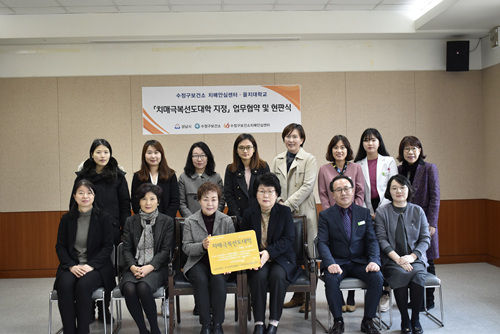 성남시 수정구보건소 치매안심센터는 을지대학교를 「치매극복선도대학」으로 지정하고 2월 27일 오후 2시 수정구보건소장 및 관계 공무원, 을지대학교 간호대학장 및 교수 등이 참석한 가운데 ‘치매선도대학 업무협약 및 현판식’을 개최하였다.