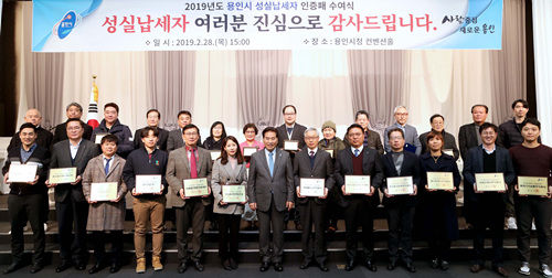 용인시는 3월3일 납세자의 날을 앞두고 28일 용인시청 컨벤션홀에서 납세문화 정착과 시의 재정확충에 기여한 성실납세자 50명에게 인증패와 인증현판(법인) 등을 수여했다.
