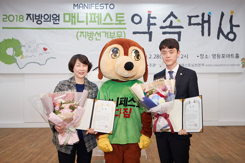 용인시의회 유진선, 정한도 의원이 28일 오후 2시 영등포아트홀 2층에서 열린 ‘2018 지방의원 매니페스토 약속 대상 시상식'에서 수상자로 선정됐다.