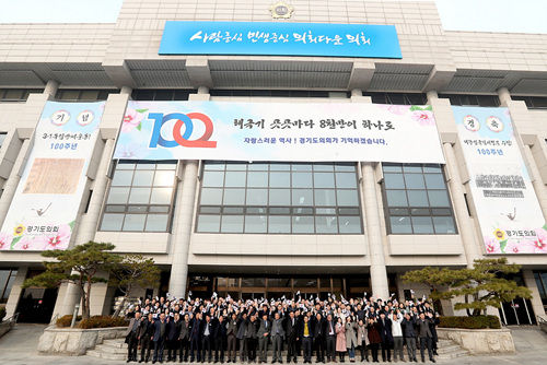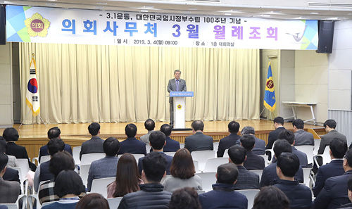 한편, 이날 송한준 의장과 의회사무처 직원들은 이날 월례조회에 앞서 의회 현관 앞에서 3.1운동 및 임시정부수립 100주년을 기념해 만세삼창 등의 퍼포먼스를 진행했다. 이어 월례조회에서는 독립운동사를 담은 동영상을 시청하며 3·1운동의 의미를 되새기는 시간을 가졌다.