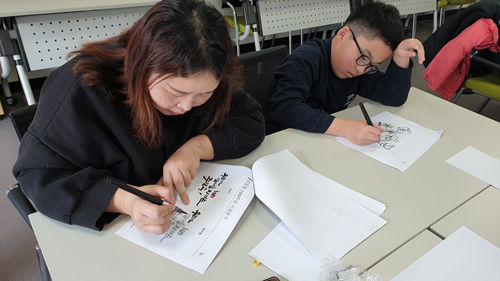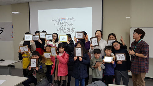 수원시 일월도서관은 3.1운동 100주년을 기념한 문구를 캘리그라피(손글씨)로 표현한 ‘한글 캘리그라피 가족체험 특강’을 열었다.