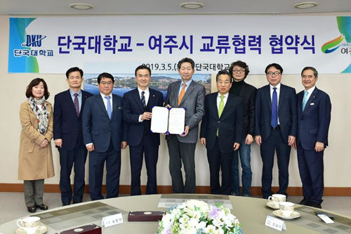 여주시(시장 이항진)는 2019년 3월 5일(화) 오후 2시30분에 단국대학교 죽전캠퍼스 총장실에서 상호 협력을 통한 지역사회 발전을 모색하고자 교류협약(MOU)을 체결했다.