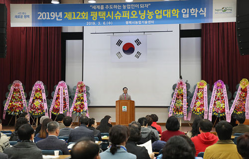 평택시(시장 정장선)는 지난 6일 농업기술센터 대강당에서 입학생과 농업관련기관단체장 등 150여명이 참석한 가운데 2019학년도 제12회 슈퍼오닝농업대학 입학식을 개최했다.